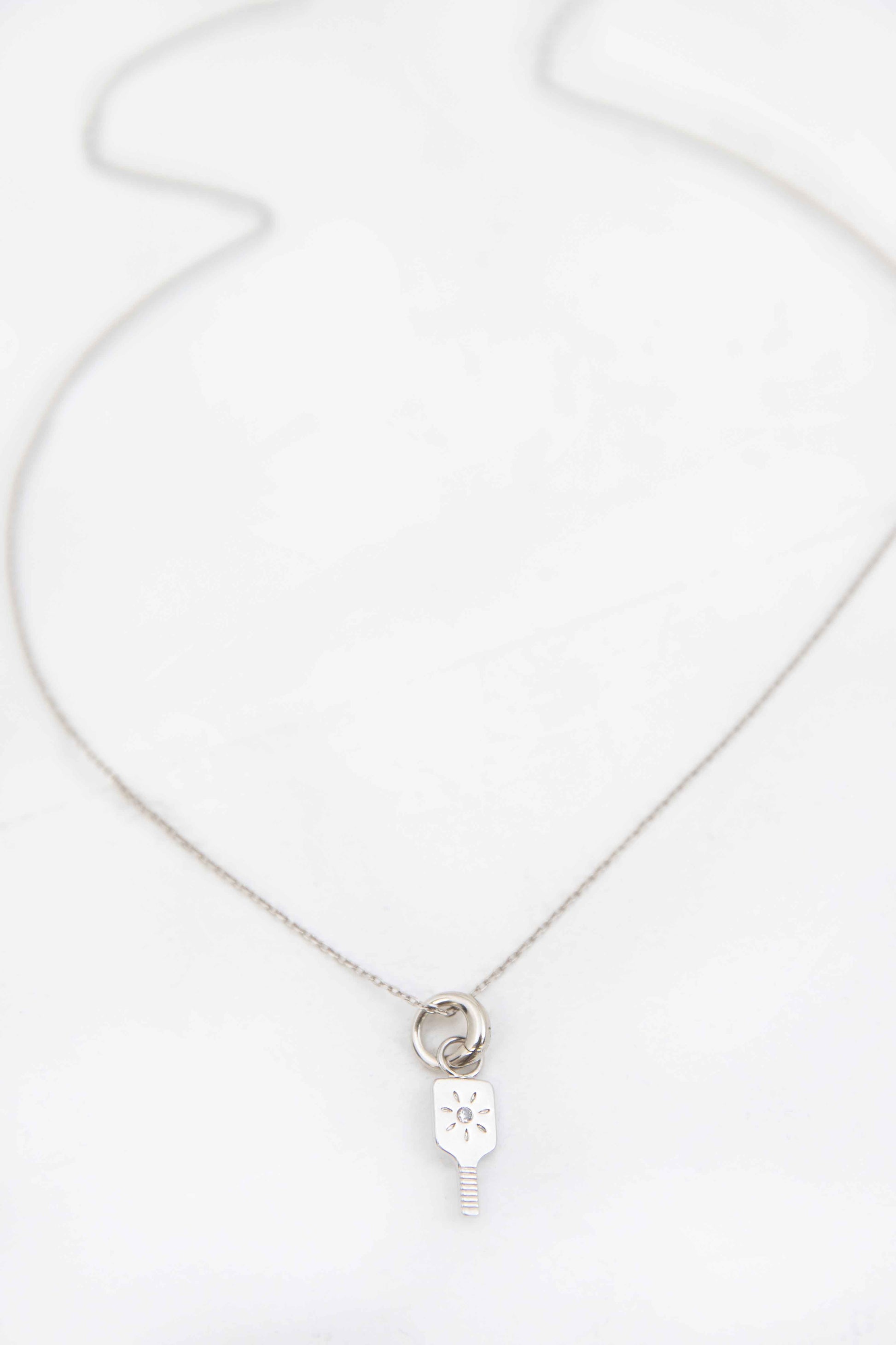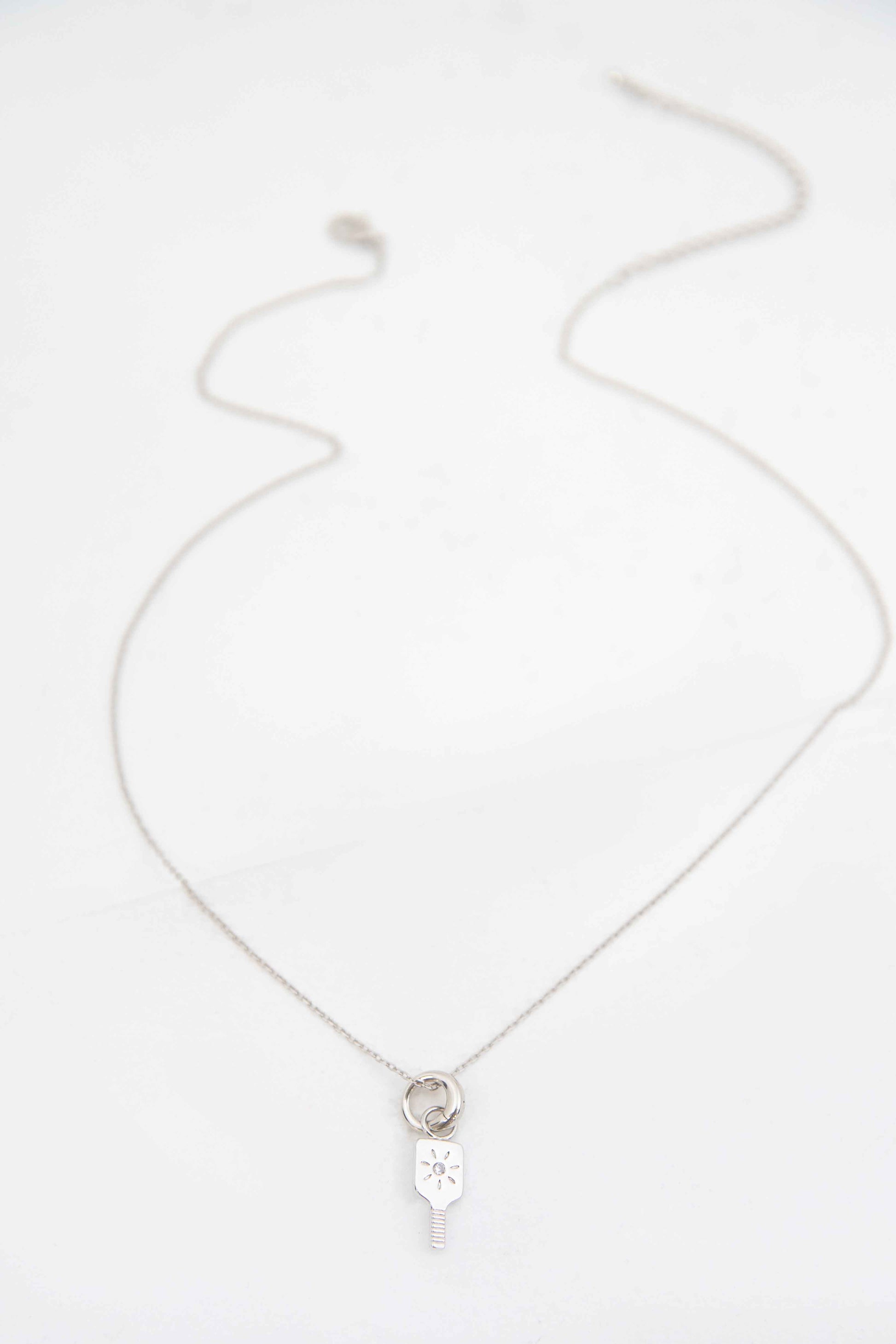 Serve up some fun with the pickleball paddle charm necklace in silver. Whether you're a competitive player or a casual fan, this charming accessory is your ticket to showing off your pickleball passion with a wink and a smile.