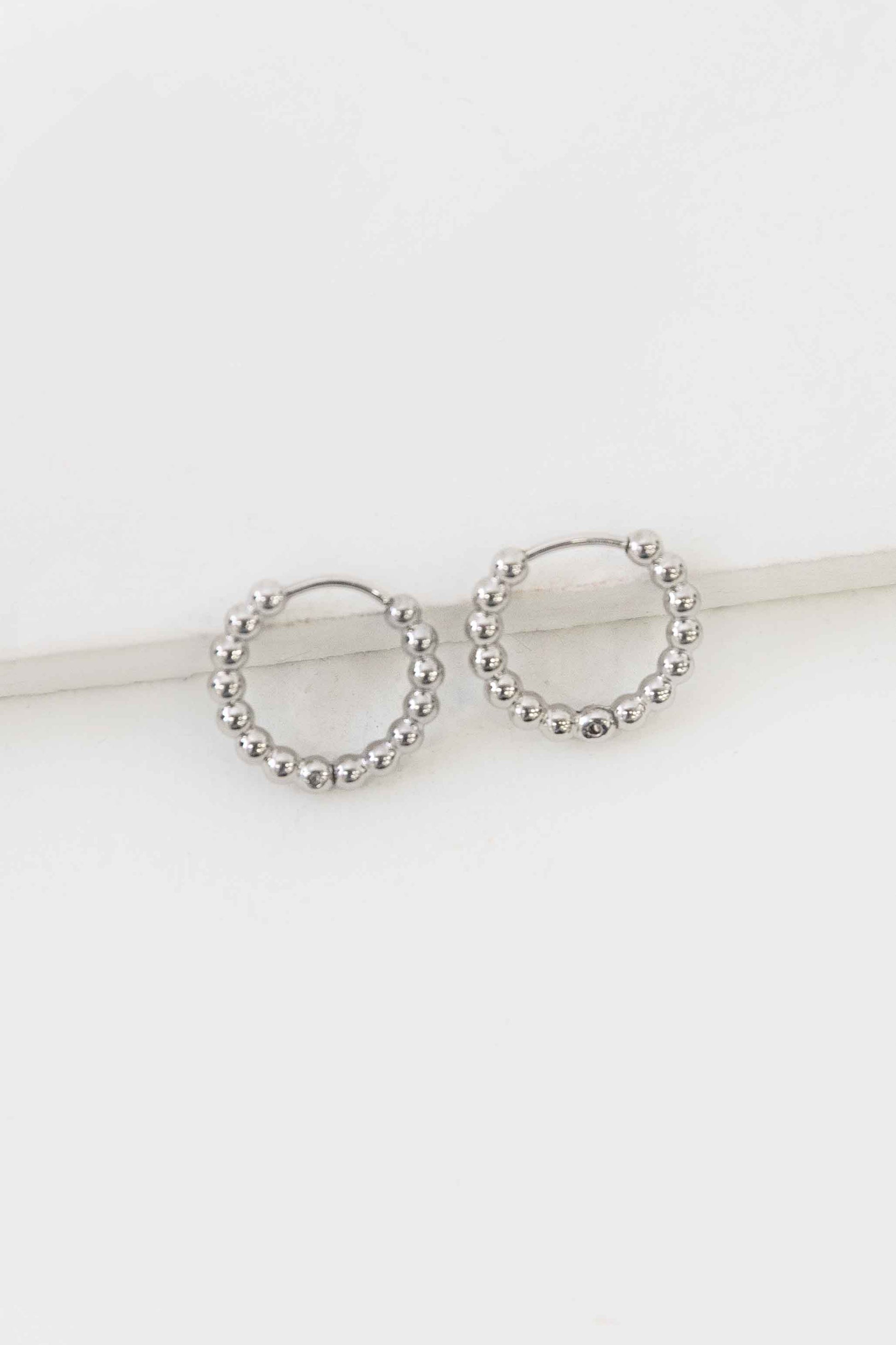 Small silver hoop earrings featuring a textured ball bead design. The dimensional bead detailing creates visual interest while maintaining a refined, understated look. These silver ball hoop earrings are a wardrobe essential.